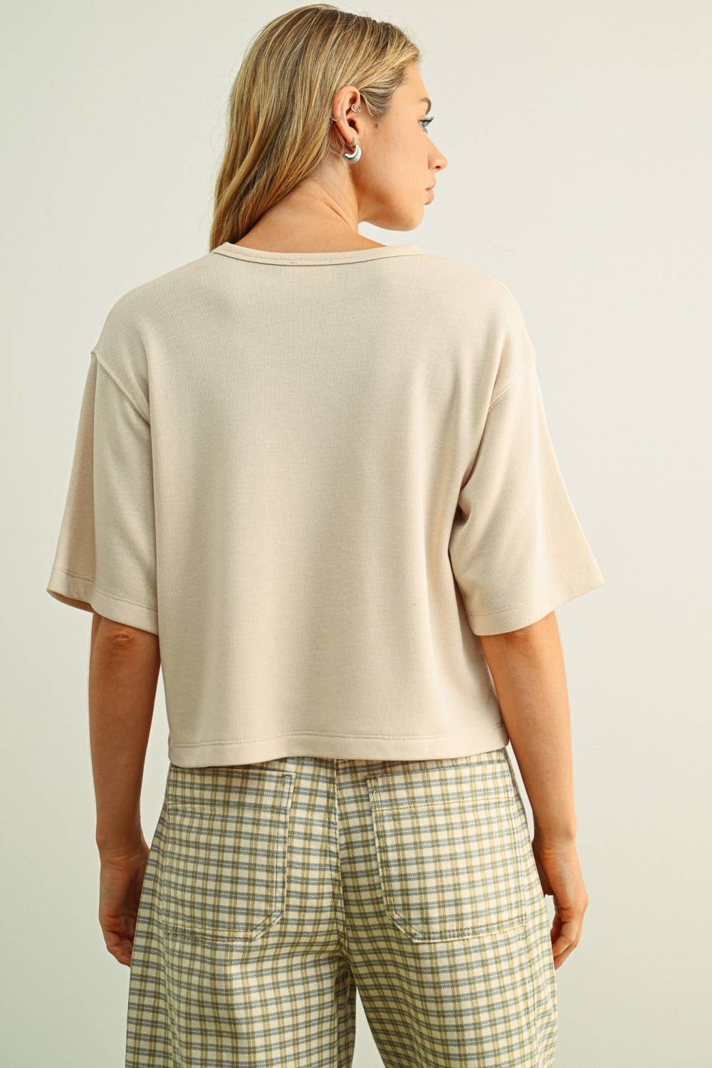OATMEAL SOFT BRUSHED FABRIC SHORT SLEEVE KNITTED TOP