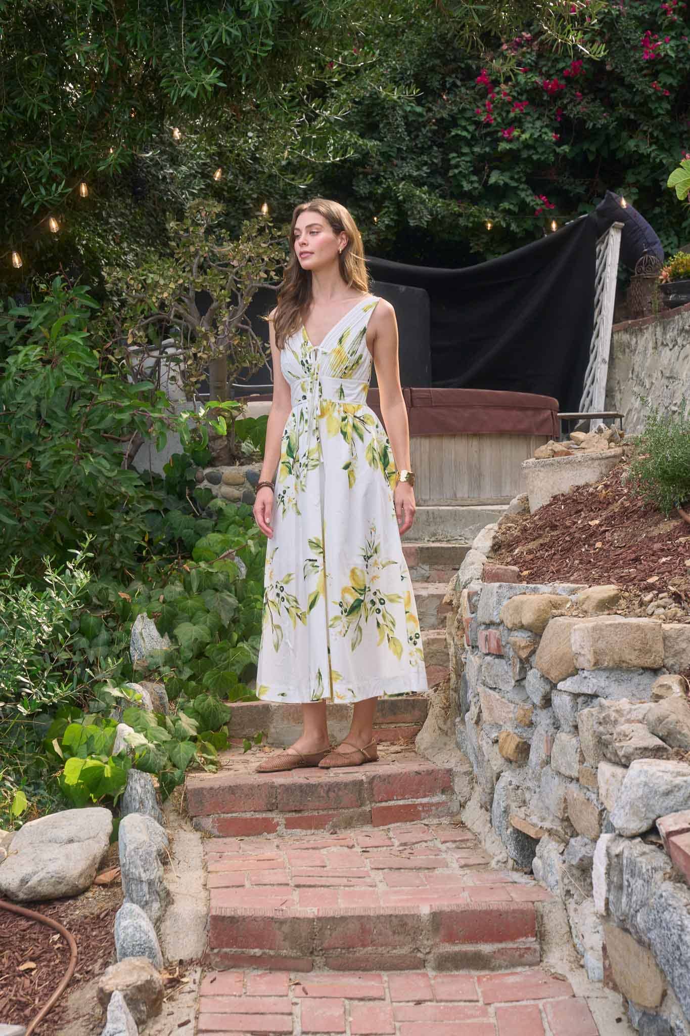 Effortlessly elegant, this floral midi dress brings joy to any occasion. The flattering V-neckline and adjustable straps offer a custom fit, while the pleated bust and front tie detail add playful dimension. The A-line silhouette skims beautifully, and the lined cotton shell keeps you comfortable all day long. Perfect for garden parties, brunches, or casual outings.
