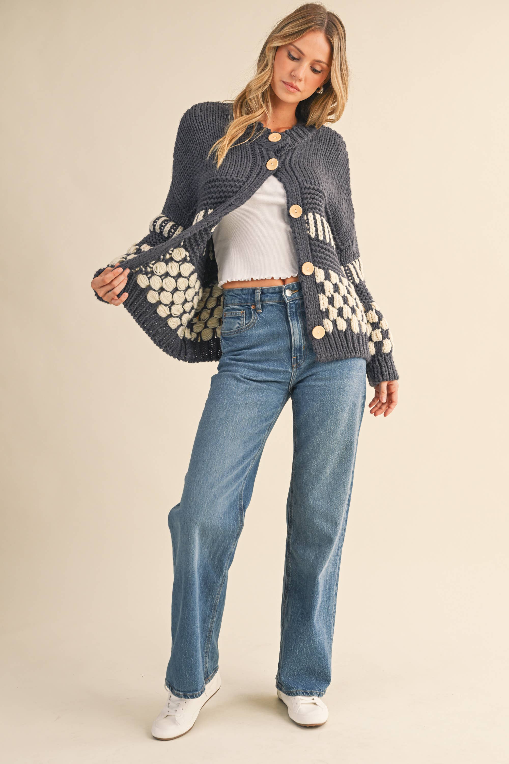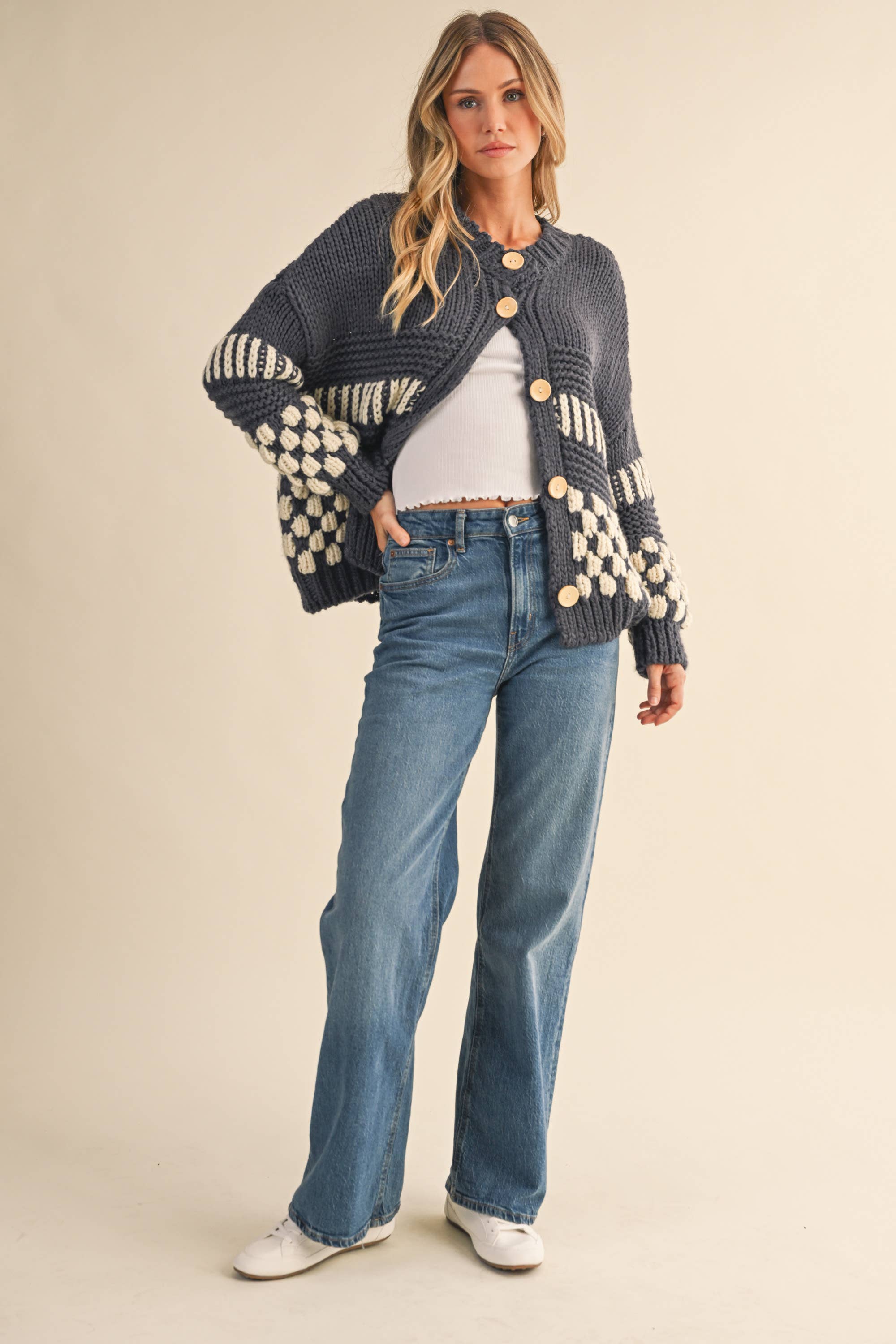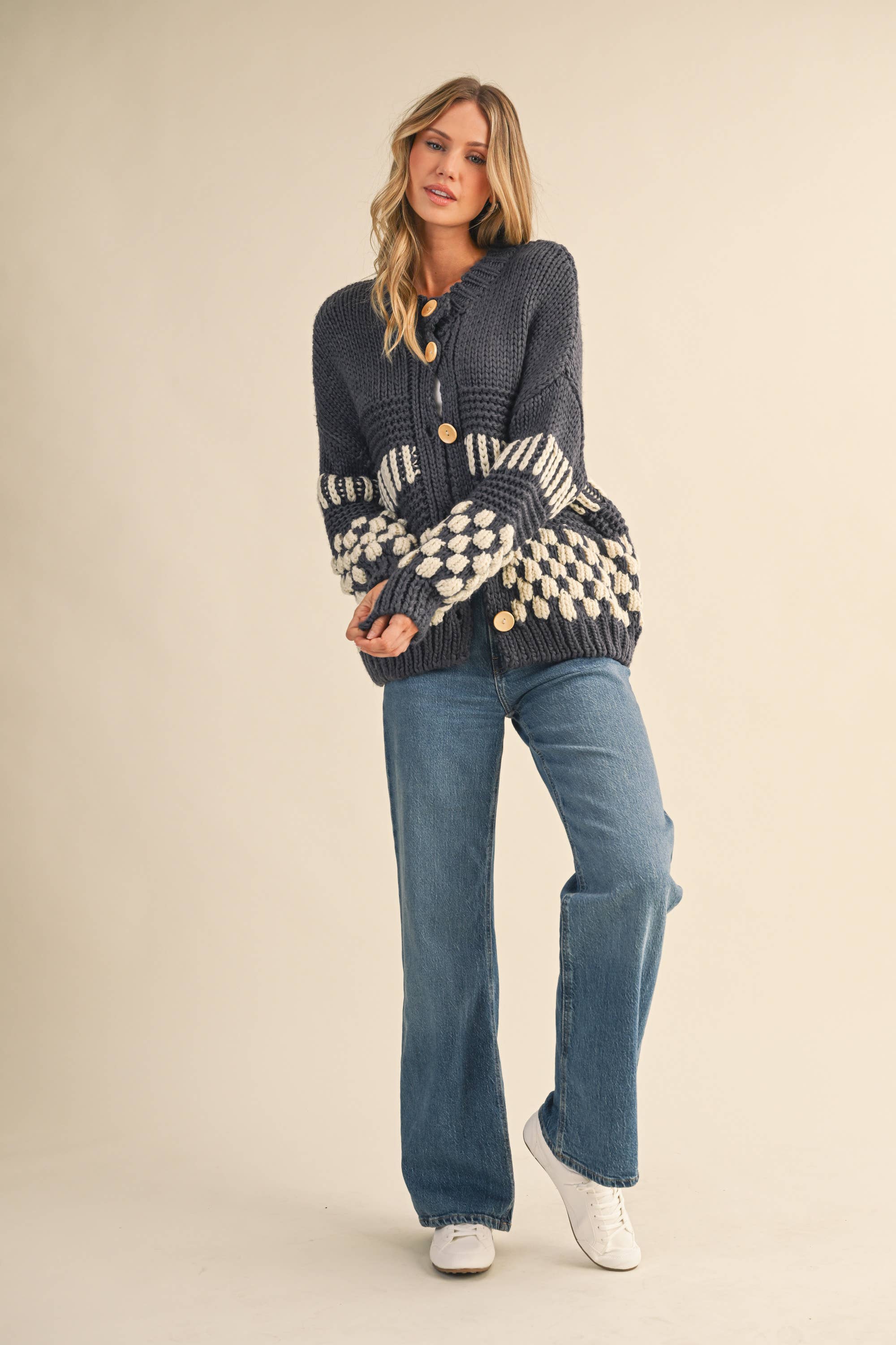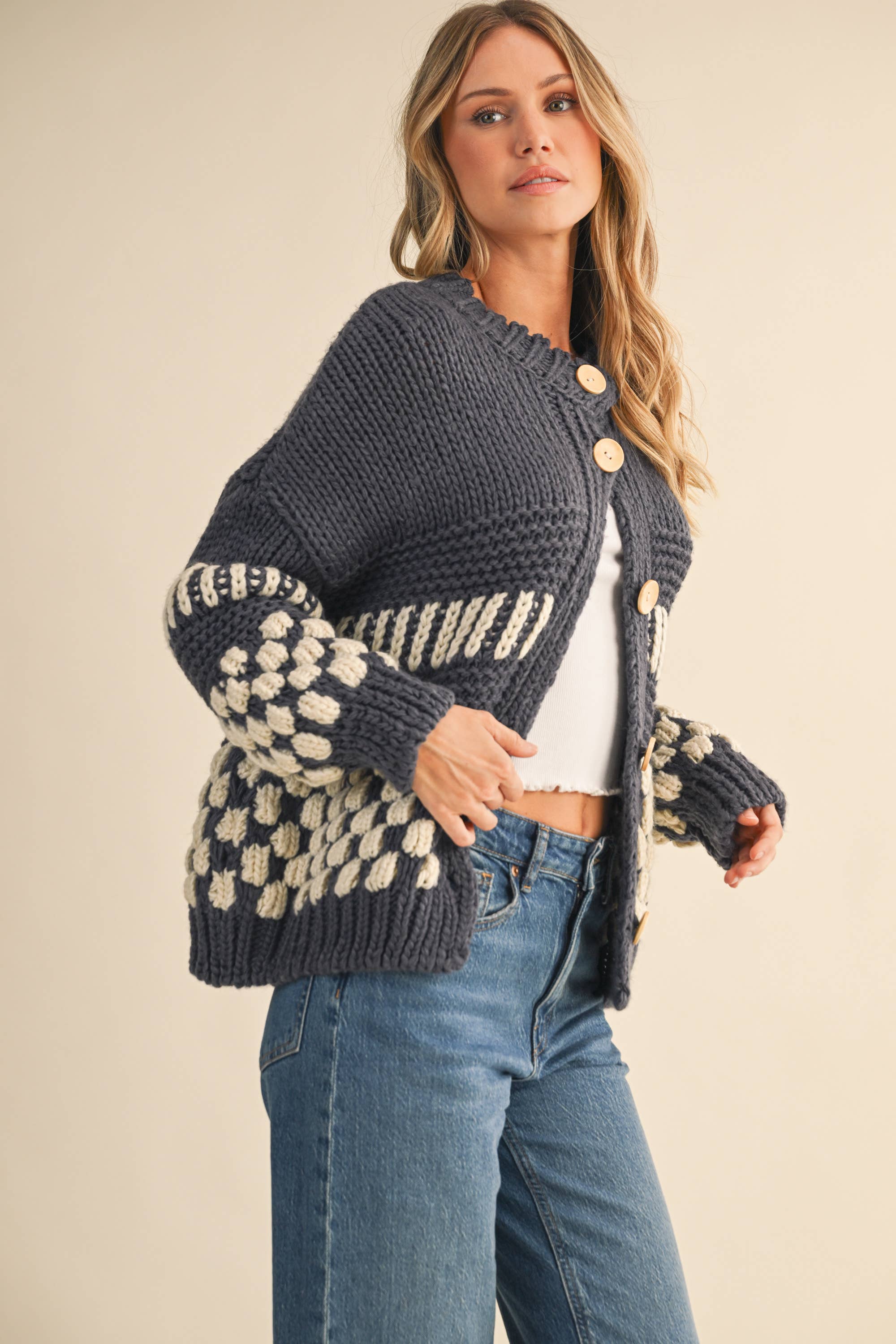 Wrap yourself in cozy charm with our checkered pattern chunky knit cardigan. This playful piece features a bold checkered design that adds a fun twist to your casual wardrobe. Crafted with thick, soft yarn, it provides warmth without weighing you down. Whether you're curling up with a book or stepping out for a brisk autumn stroll, this cardigan brings comfort and cheerful style together. Its roomy fit lets you layer up easily, making it your new favourite go-to for chillier days.