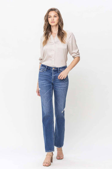 COMFORT STRETCH DENIM, MID RISE WAIST, DISTRESSED DETAIL, FULL LENGTH, STRAIGHT JEAN