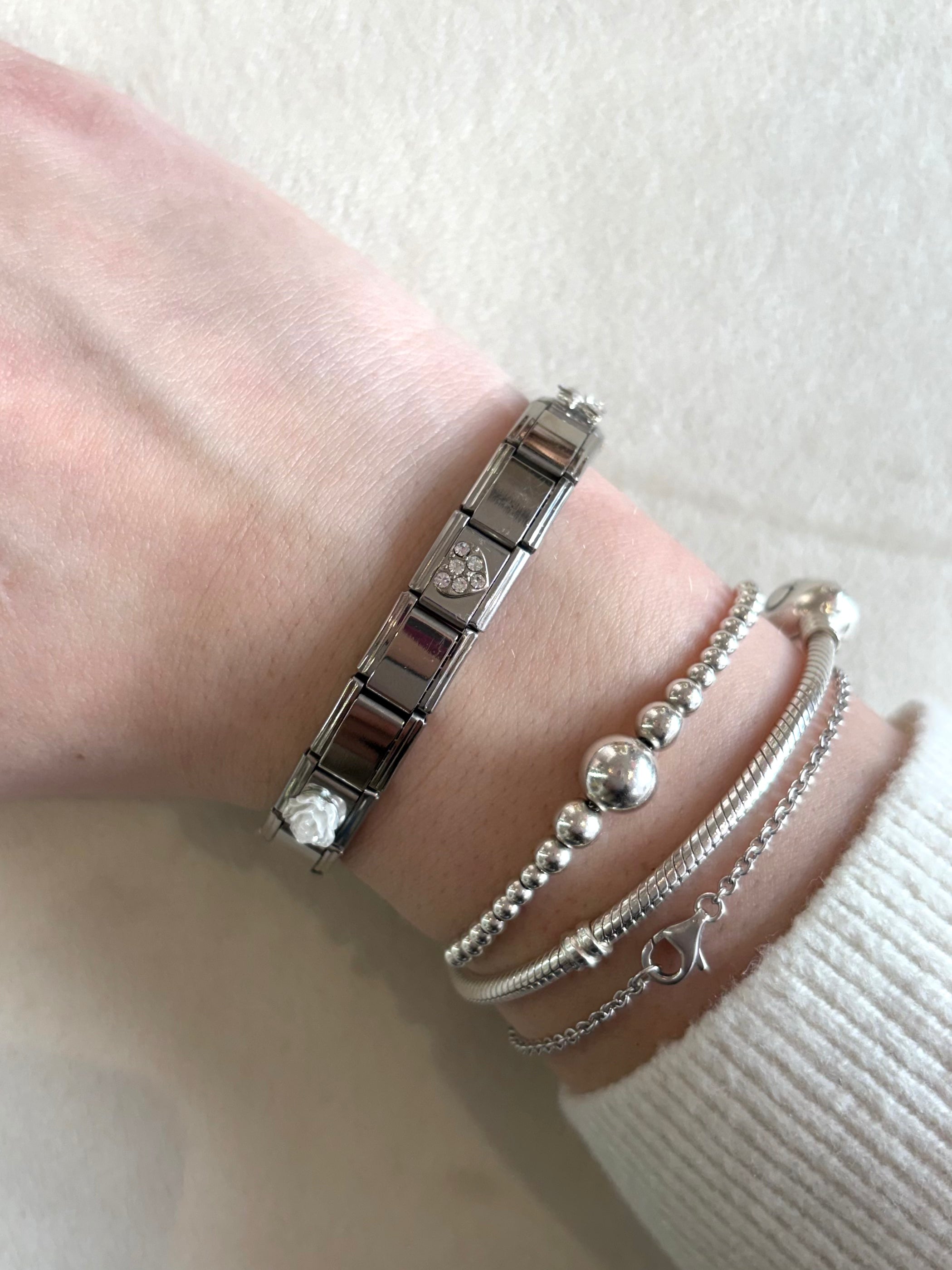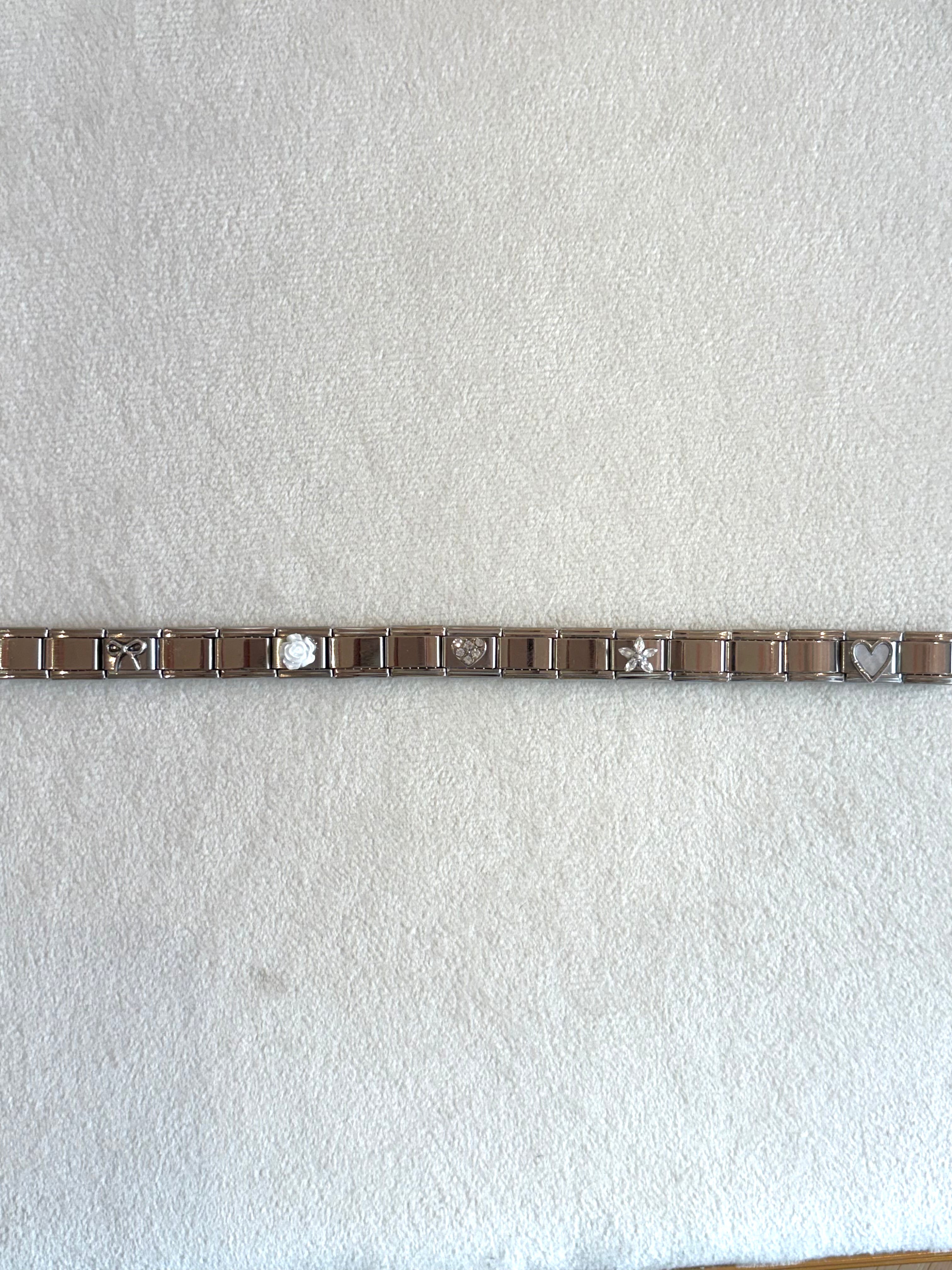 This ready-to-wear silver Italian charm bracelet arrives pre-assembled with five gorgeous charms—a delicate bow, white rose, sparkling heart, shimmering flower, and sweet white heart. Perfect for gift-giving or treating yourself, it's designed for quick pickup so you can start showing off your new accessory right away. Mix elegance with a touch of sparkle in one✨