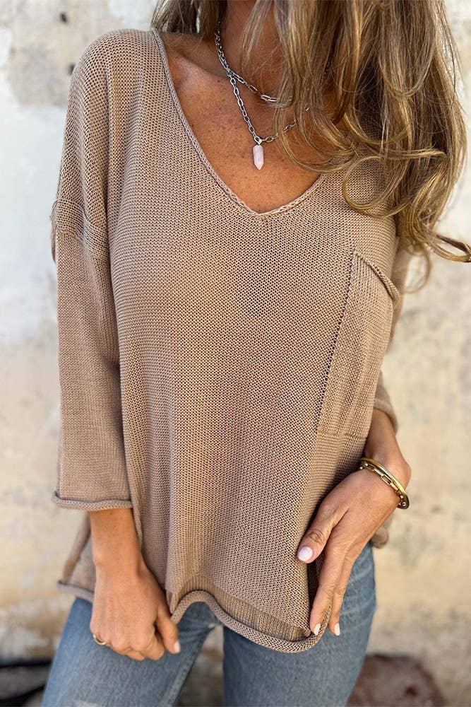 This knit top combines style and practicality in one go. The V-neckline flatters while soft, quality fabric keeps you cozy all day. A handy front pocket adds charm and function. Dress it up or down—it works with everything from jeans to office wear.