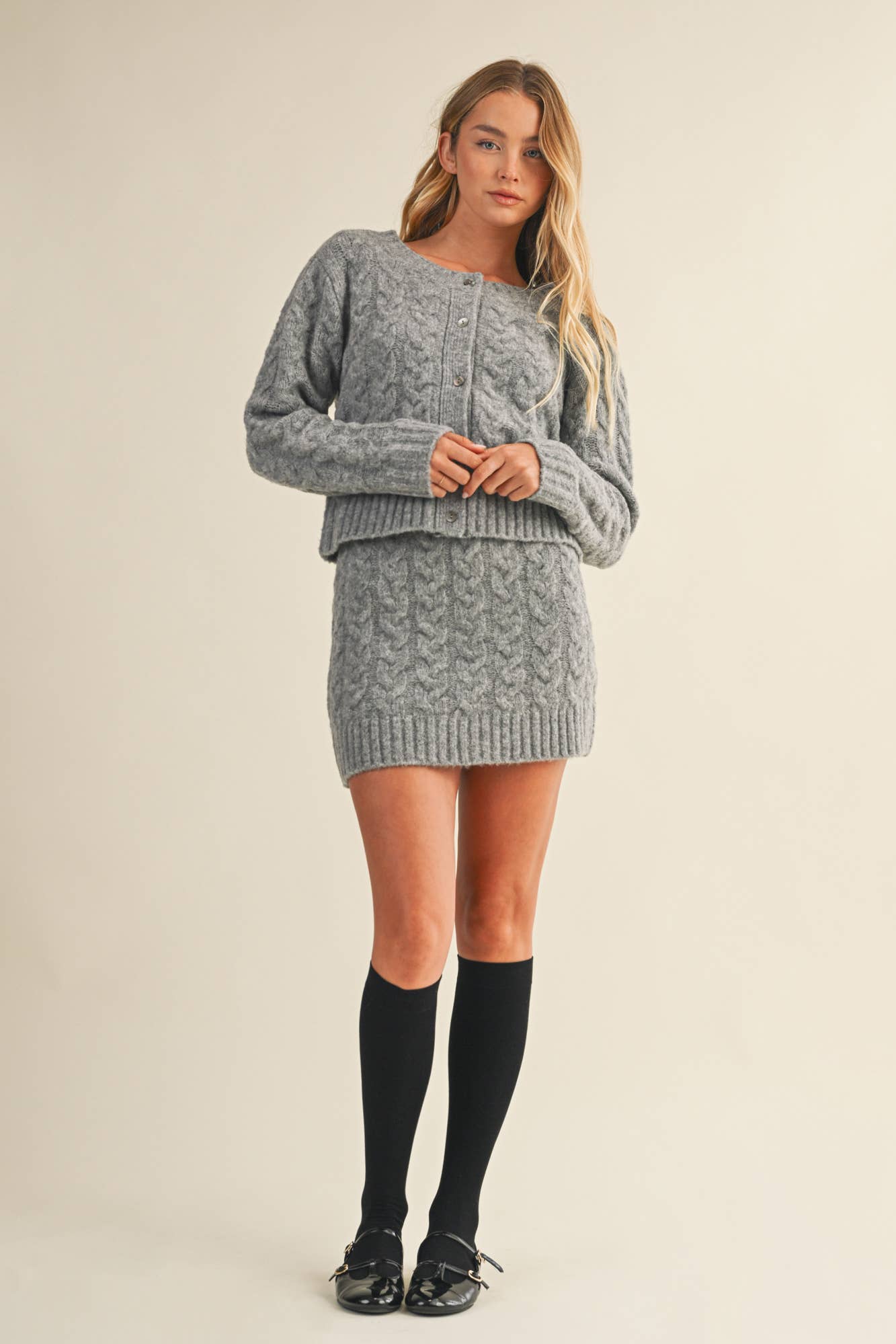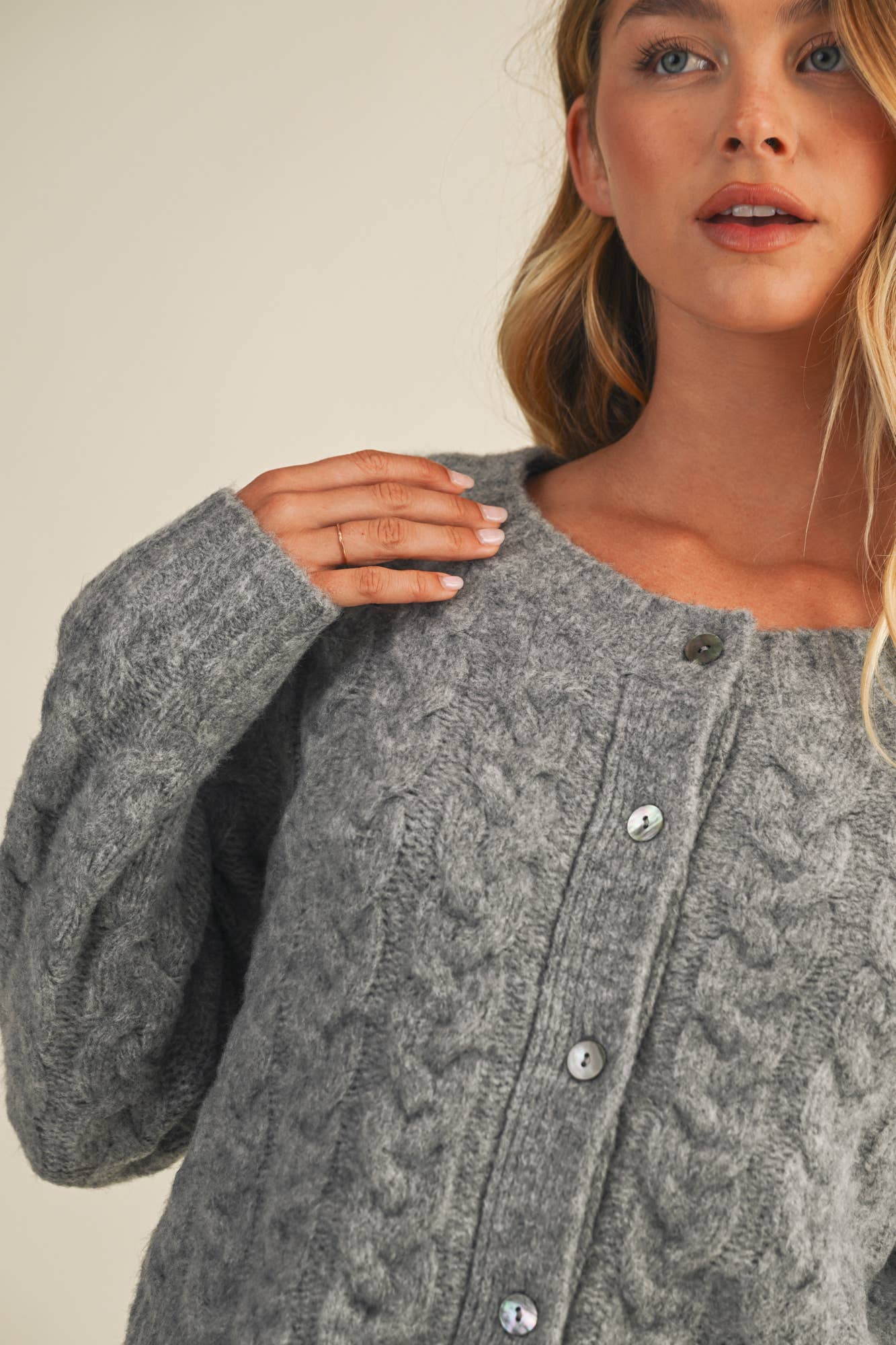 Wrap yourself in cozy charm with this playful cable knit cardigan! Featuring a classic button-down front and a flattering crew neckline, it’s designed to bring warmth and style to your everyday look. The cropped length adds a modern twist, perfect for layering over your favorite high-waisted jeans or skirts. Soft and snug, this cardigan pairs perfectly with casual outfits while adding a touch of fun texture. Whether you're lounging at home or heading out, this knit will keep you comfy and effortlessly chic all day long.