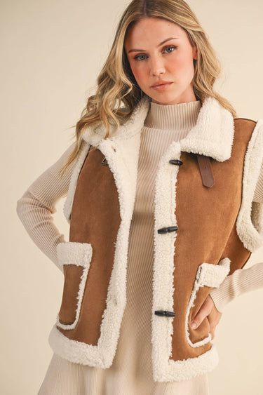 Stay snug and stylish with this Faux Suede Sherpa Vest, your new favorite layer for chilly days. Crafted with a soft faux suede exterior and a warm sherpa lining, it wraps you in cozy comfort. Featuring handy patch pockets and a fun toggle closure, it’s perfect for stashing essentials while adding a playful touch to any outfit. Whether you're out exploring or lounging at home, this vest keeps the cold at bay with a flair that’s as charming as it is practical.