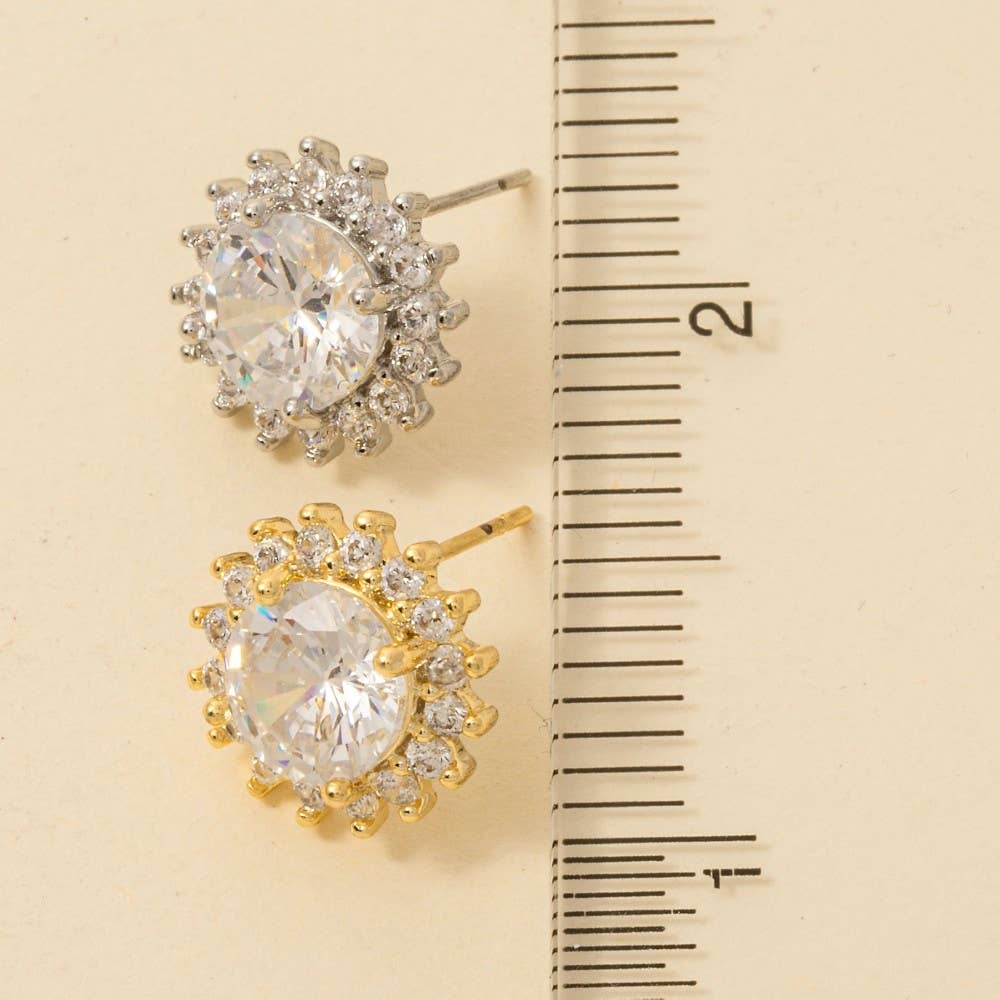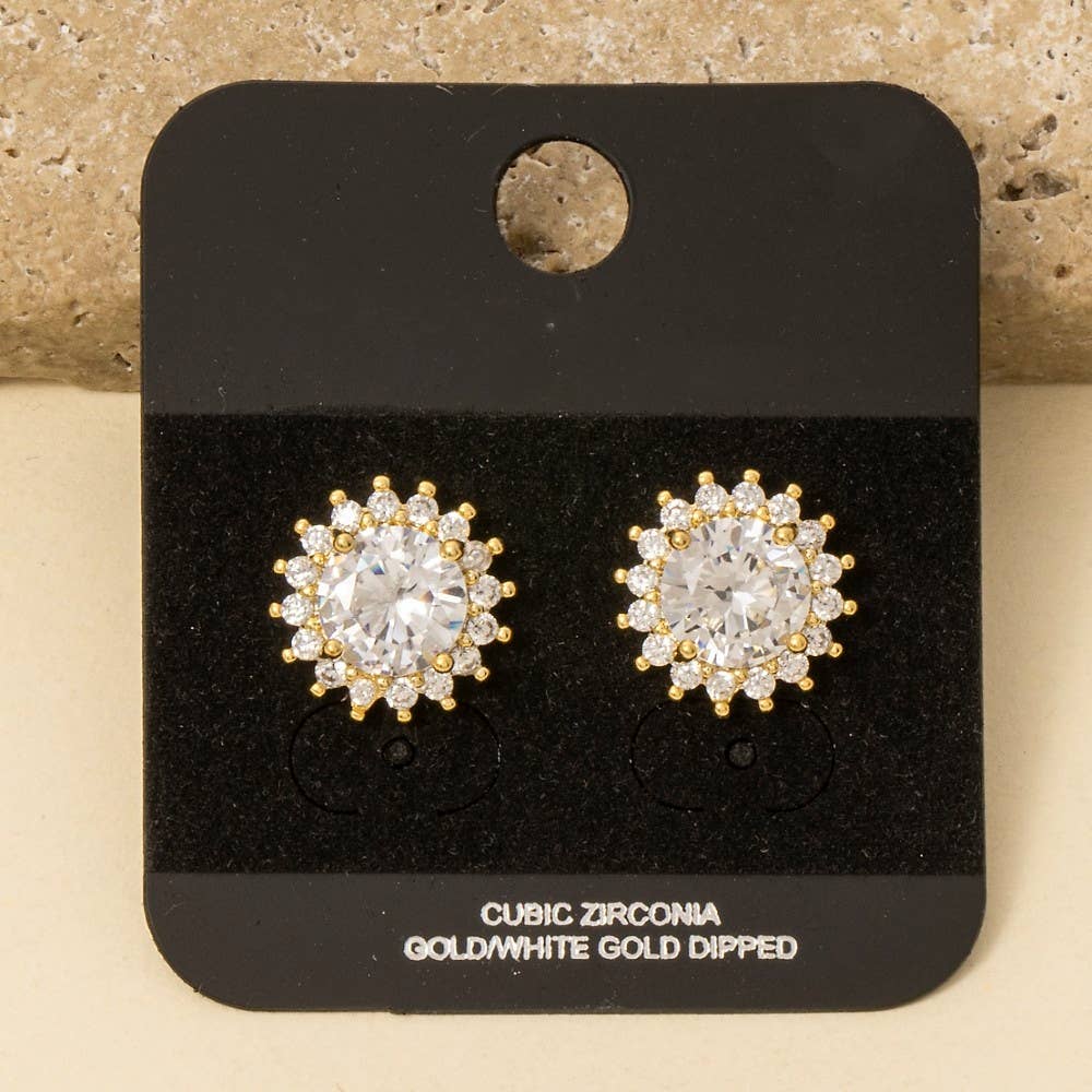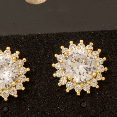 Effortlessly elevate your style, this pair of stud earrings introduces an exceptional gold dipped large cubic zirconia sun design. A stylish pair of stud earrings that's perfect for complementing your favorite outfit. This pair of stud earrings is made with 60% Cz 40% Brass.