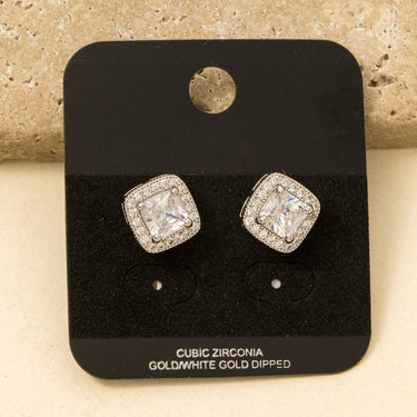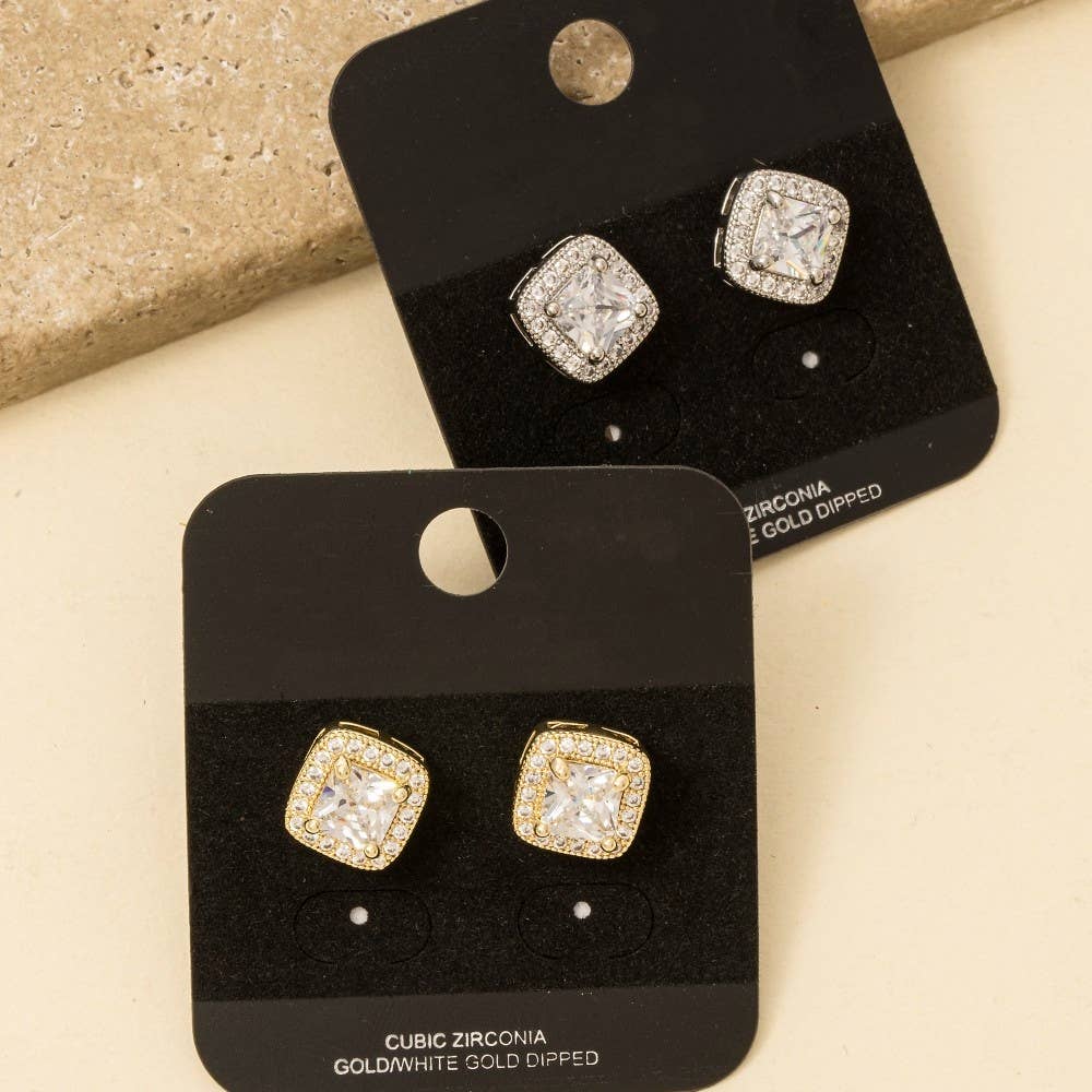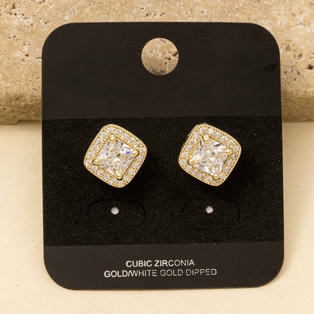 A classic design with a modern twist, this pair of stud earrings incorporates a flawless gold dipped square halo cubic zirconia design. Transform your outfit from ordinary to extraordinary with the touch of elegance provided by this versatile pair of stud earrings. This pair of stud earrings is made with 60% Cz 40% Brass.