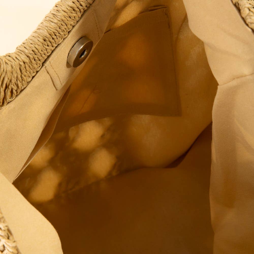 Carry your essentials in style with this charming square straw tote. The woven braided design brings natural texture and warmth to any look—from beach days to farmers market runs. Spacious enough for all your treasures, this versatile bag pairs beautifully with casual outfits and elevated ensembles alike. A playful yet polished accessory that celebrates both function and flair. With a cloth lining and magnetic closure.