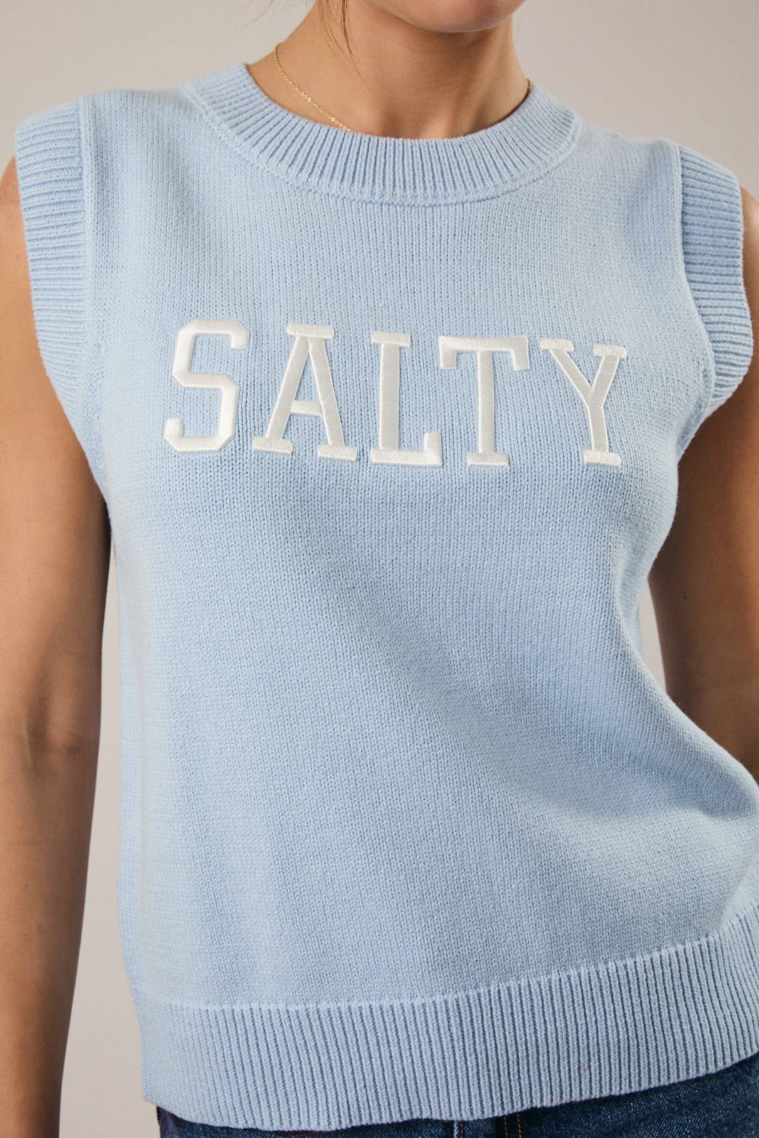 Layer up with attitude in this crew neck sweater vest, featuring a cheeky "SALTY" embroidered design. Whether you're going for effortless cool over a tee or pairing it with your go-to denim and sneakers, this versatile piece brings personality to any outfit. A wardrobe essential that works as hard as your style does.