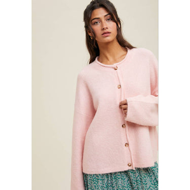 Stay cozy and stylish this season with our Crew Neck Cardigan, a soft-touch button-up sweater designed to keep you warm through fall and winter's chill. Featuring functional buttons for easy layering and raw edge detailing that adds a trendy, carefree vibe, this cardigan effortlessly blends comfort with casual cool. Its versatile design makes it perfect for dressing up or down, whether you're headed to a casual brunch or curling up with a good book. Embrace the perfect mix of snug warmth and playful style with this wardrobe must-have.