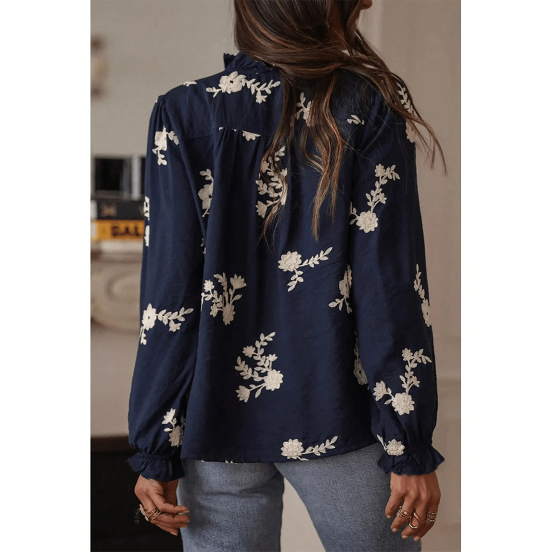 Navy Bubble Sleeve Ruffle Collar Embroidered Top
