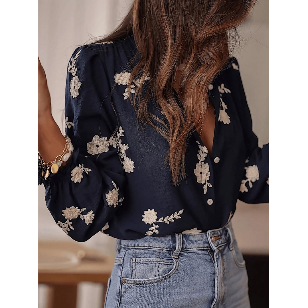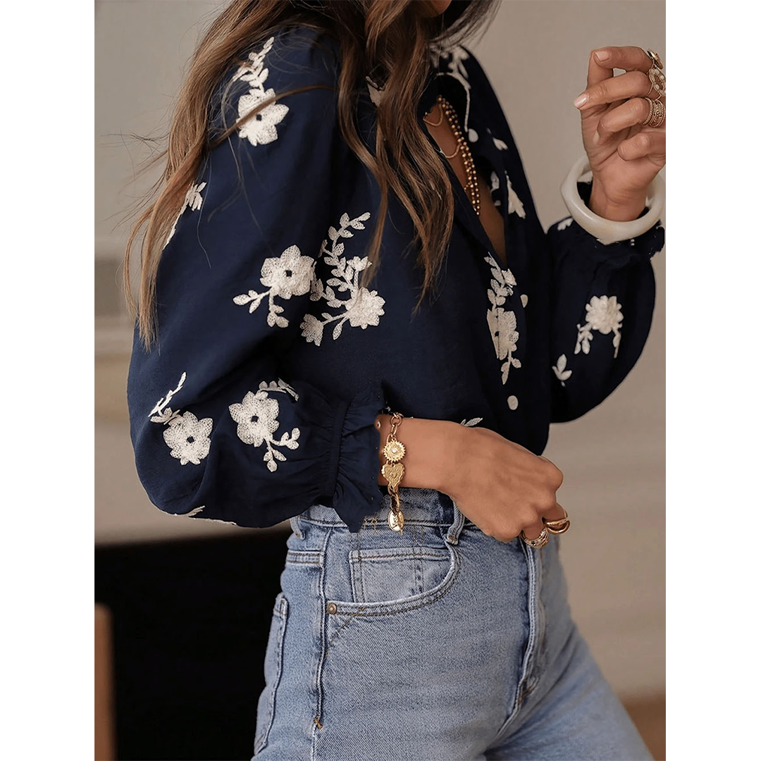 Bubble sleeves and a ruffled collar bring playful charm to this embroidered casual top. Delicate embroidery adds texture and refinement, while the relaxed fit keeps you comfortable all day. Pair with jeans, skirts, or trousers for effortless everyday style.