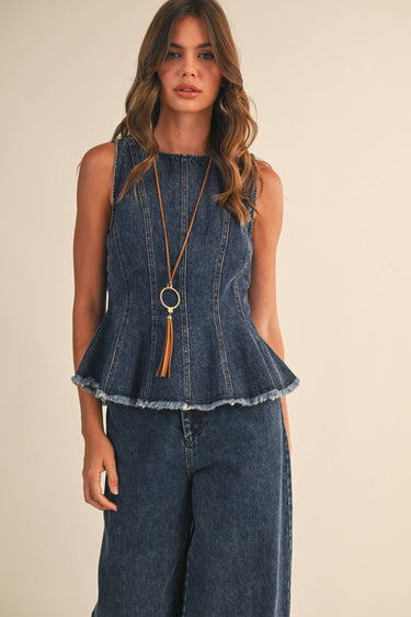 This adorable sleeveless denim peplum top is a stylish and adaptable favorite that mixes laid-back ease with a touch of feminine charm. The sleeveless cut keeps you cool and ready for anything, while the flared peplum adds a lively, fun flair to your outfit. Ideal for pairing with your go-to jeans or a cute skirt, this top injects a playful, flirty energy into your daily wardrobe. Whether you're heading out for brunch or enjoying a casual day, this denim gem offers both comfort and confidence with every wear.
