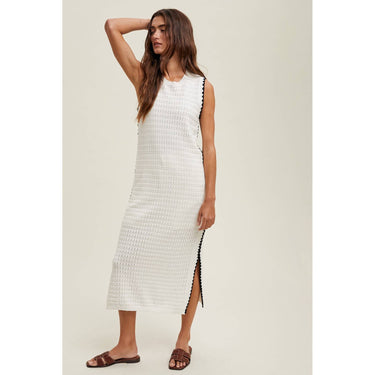 Versatile textured sweater tank midi dress crafted from 100% cotton. Features a semi-sheer design with flattering side seam details and slits for easy movement. Perfect as a standalone piece or stylish swim coverup. Model wears size small (43" total length). Colors may vary slightly due to lighting and monitor differences.